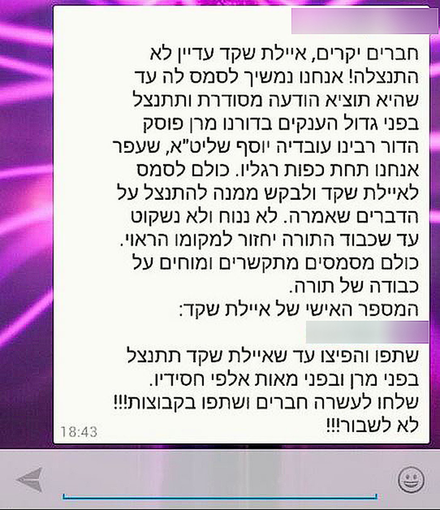 לסיום מבטיח הפעיל, כי כל עוד שקד לא תתנצל בפה מלא על דבריה, הסמסים ימשיכו לזרום למכשיר הסלולארי שברשותה.