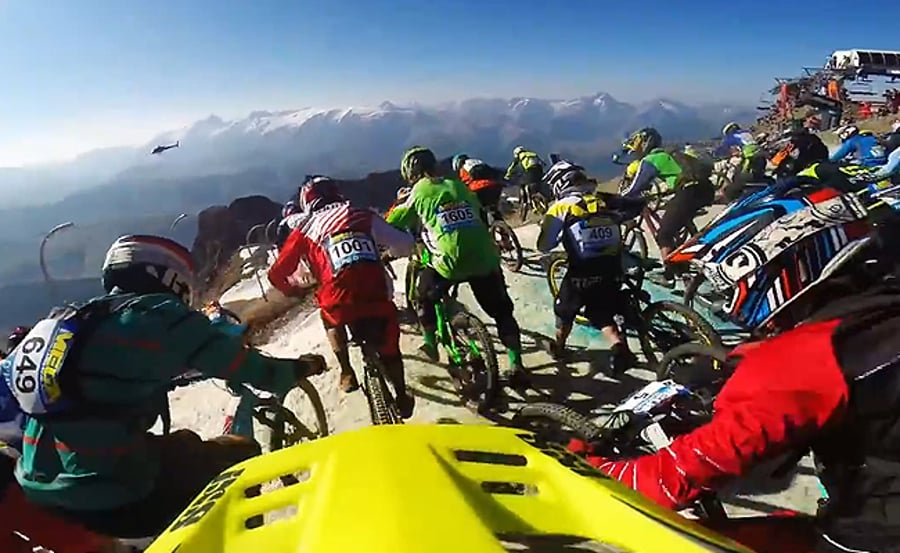 זה אחד ממירוצי האופניים המסוכנים ביותר שראיתם: חבורת רוכבים יצאה למירוץ במורד הר תלול מלא בקרח ושלג, במהלכו חלקם התרסקו אחד בתוך השני. למרבה המזל זה הסתיים ללא הרוגים.