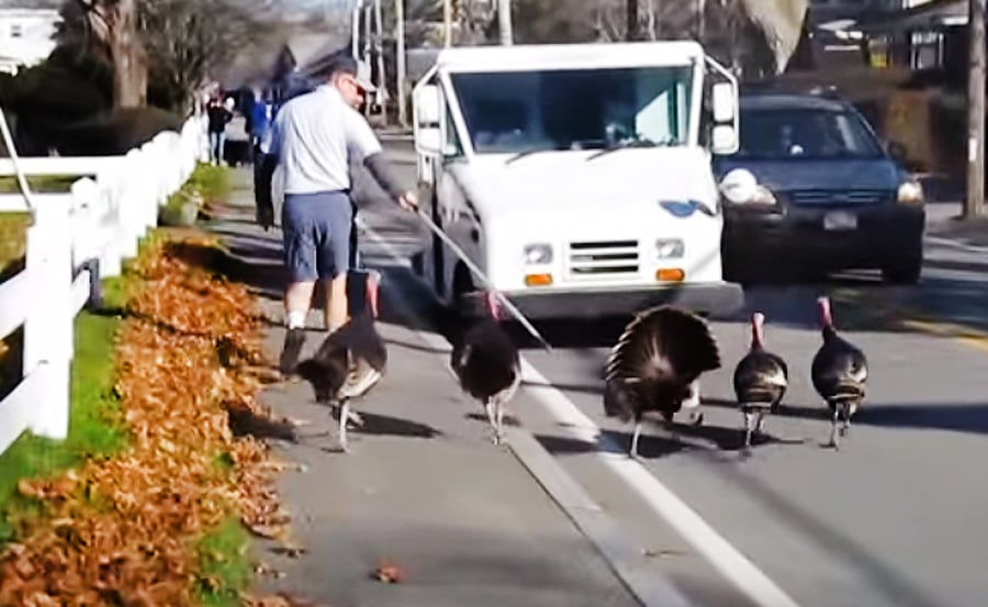רוב הדוורים בעיר הזאת נתקלים בכלבים שקופצים עליהם, לא הדוור הזה, שמחובב במיוחד על ידי תרנגולי הודו פראיים.