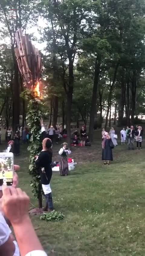 בטקס שצולם בלטביה שבצפון אירופה נראים החוגגים עם זרי פרחים על ראשם, כאשר "המנהיג" הולך עם לפיד וכולם מריעים לו.