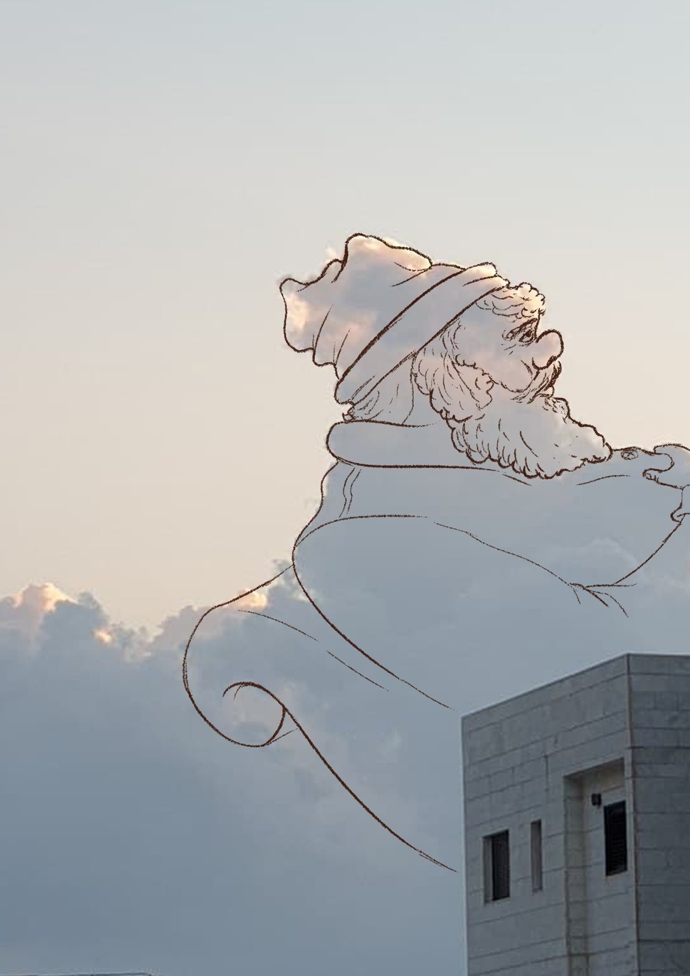 "ישבתי במרפסת כהרגלי והבטתי בעננים שבשמיים", מספר הצייר אוריאל פלד, "ובאחד מהצורות בעננים ראיתי בדמיוני סילואטה של פרצוף...".