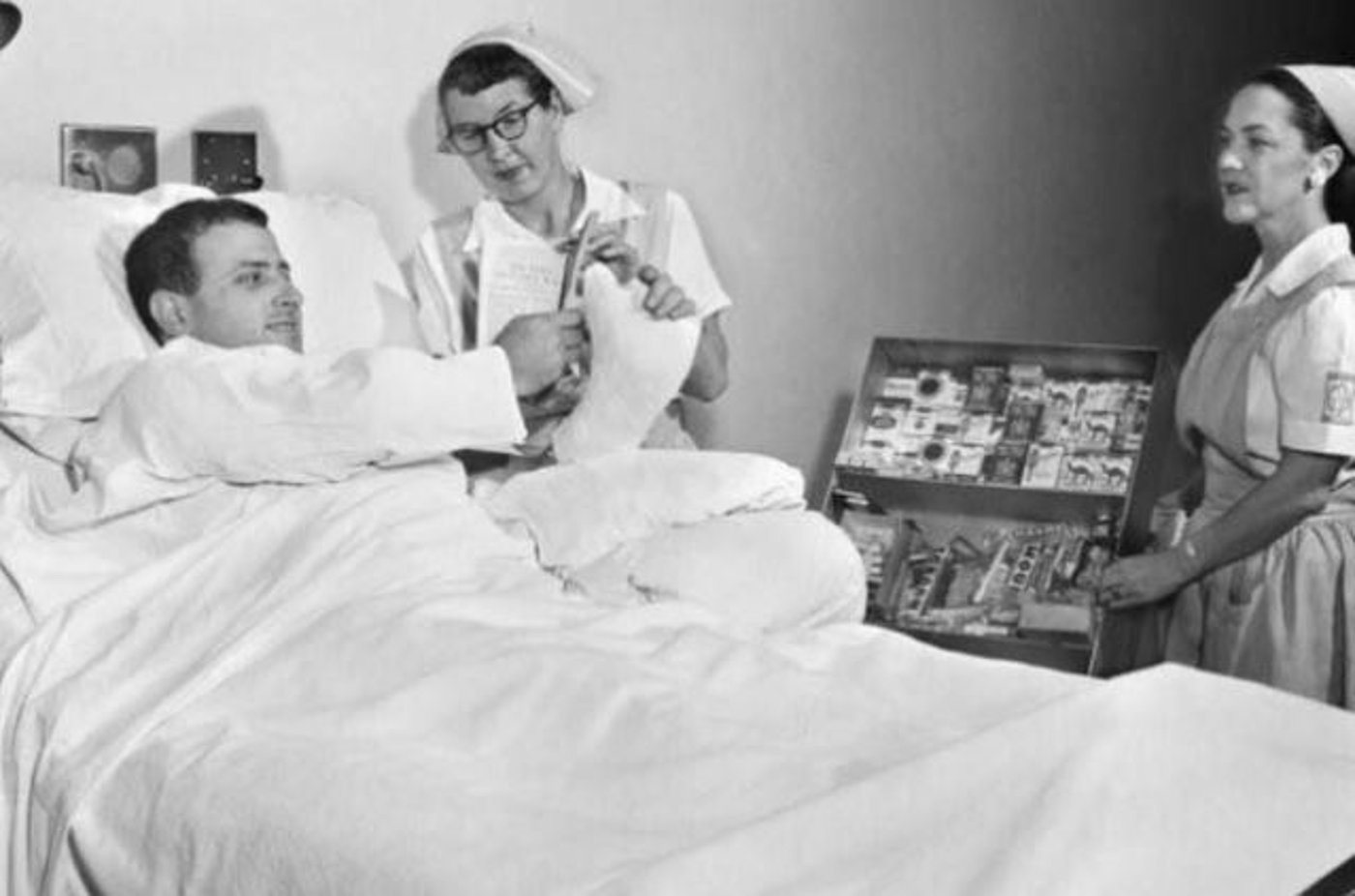 השבוע, בניו זילנד, אסרו מכירת מוצרי טבק ועישון באופן מוחלט. אז הנה תמונה מתקופה שבה לא זו בלבד שלא אסרו את העישון במקומות ציבוריים - אלא אף מכרו אותם בתוך חדרי האשפוז.