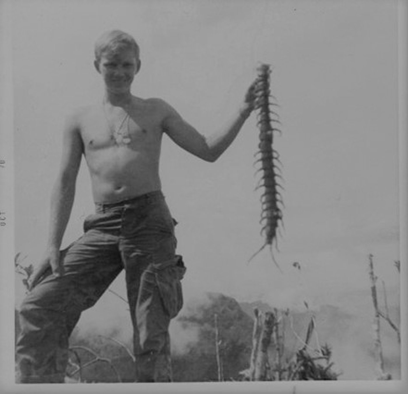 חייל אמריקני במלחמת וייטנאם טייל בג'ונגל ומצא טרף: מרבה רגליים ענק. וייטנאם 1967