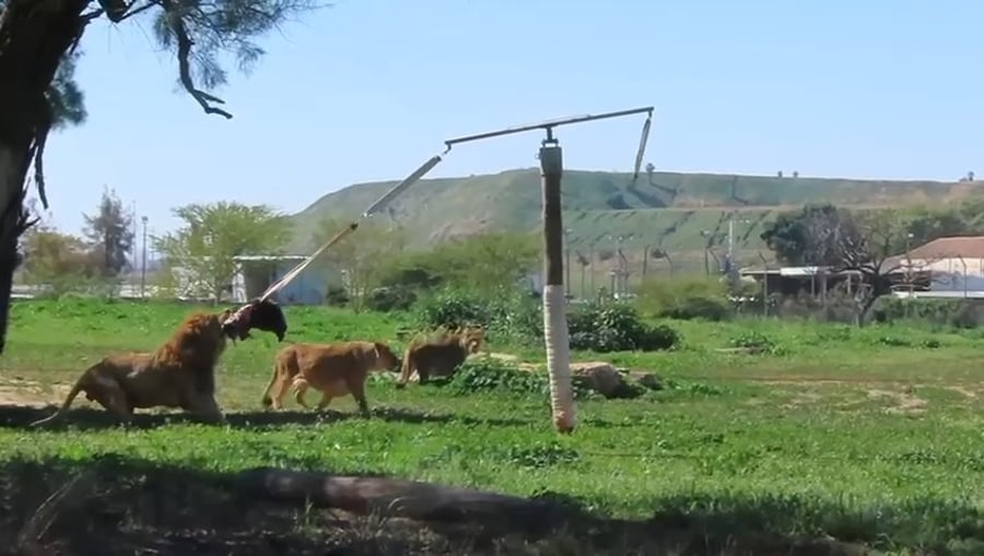 מטפלי הסוואנה תלו במתחם האריות בספארי פגר של עגל לטובת העשרה ללהקה. מטרתה של העשרה סביבתית בגני חיות היא לאתגר את בעלי החיים פיזית ומנטלית, ולעודד התנהגויות טבעיות.