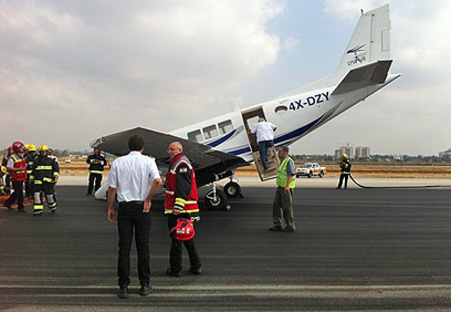 דרמה בנתב"ג: מטוס קל מדגם "זמיר" של חברת עיט שהיה בדרכו מראש פינה לתל אביב ועליו תשעה נוסעים ואנשי צוות נחת הבוקר (רביעי) בנתב"ג נחיתת חירום לאחר תקלה בכן הנסע הקדמי.