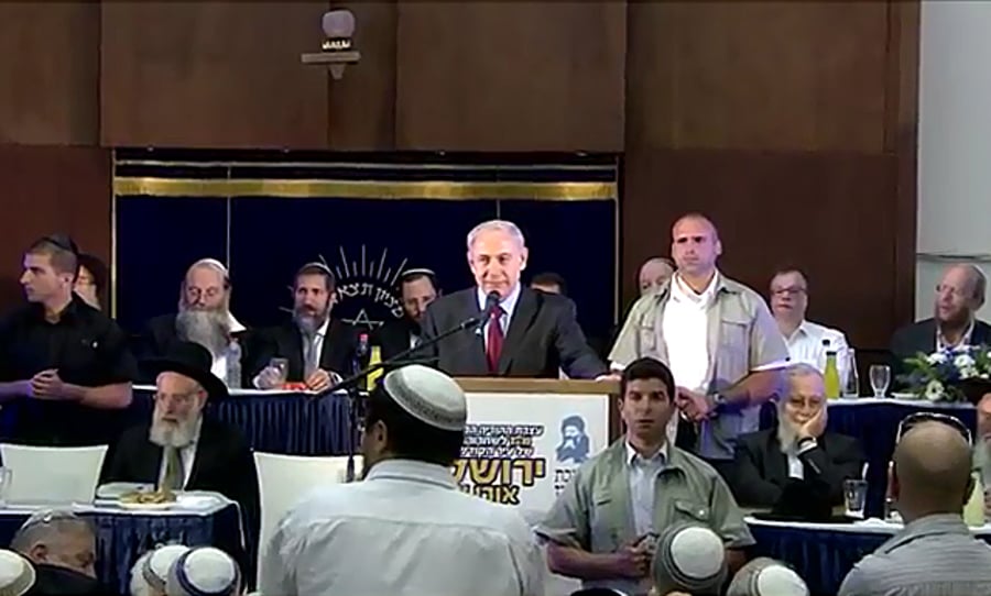 "אני מוצא גם קשר נוסף", המשיך נתניהו כשהוא פונה לראש הישיבה הרב יעקב שפירא, "משום שאביך היקר הרב אברהם שפירא זצ''ל היה מספר לי כיצד הוא כילד קטן בירושלים היה הולך לשמוע את סבי מטיף לציונות, לארץ ישראל לירושלים ולשיבת ציון. הוא אמר לי שהוא היה נואם גדול, אני מרגיש פה בבית, זה הבית שלי".