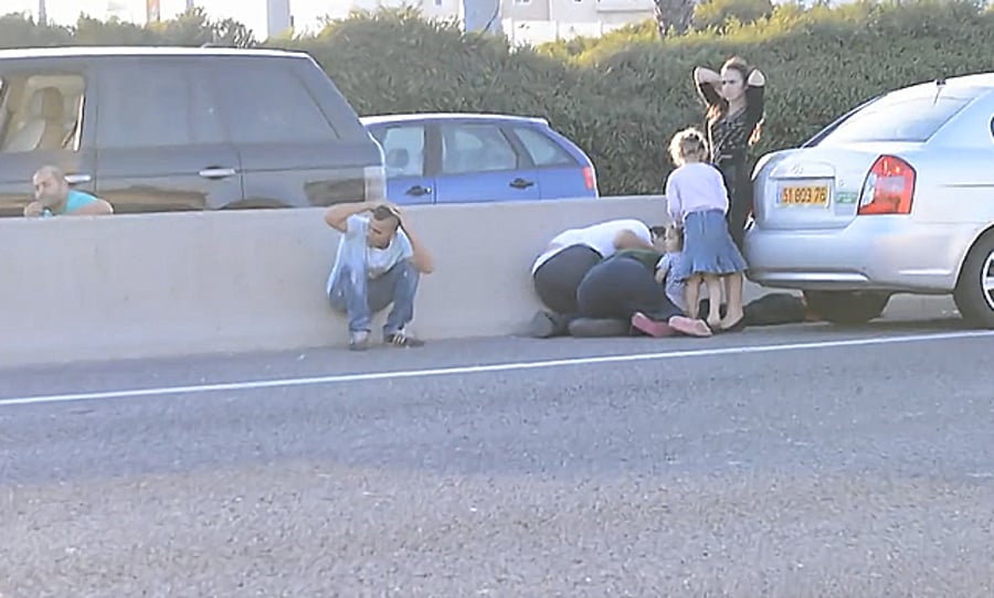 מתוך אחד הרכבים ניתן לראות כי משפחה חרדית, המונה ילדים ומבוגרים, יוצאת ומנסה לתפוס מחסה בצידי הדרך. הילדים לא הצליחו לתפוס מחסה ובשל-כך נעמדו לצד הרכב. במקביל ניתן לראות משפחות חרדיות נוספות שתפסו מחסה עד יעבור זעם.