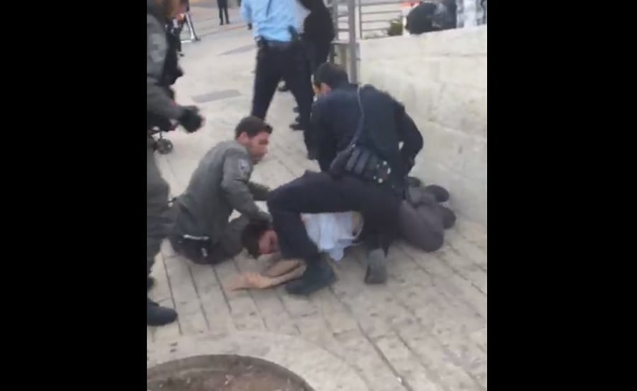 סרטון שפורסם היום (שני) מציג אלימות קשה של שוטרים כנגד פעילי ימין שקיימו הפגנה בסמוך לעיר העתיקה בירושלים. בסרטון נראים השוטרים עוצרים גבר הנראה כקטין וכשאדם נוסף נחלץ לעזרתו ומבקש מהשוטרים הסבר למעשיהם - הוא מוכה באלימות ומוטח על הקרקע תוך כדי חניקתו, זאת למרות שעל פי הסרטון לא נראה שהוא מתנגד למעצרו.