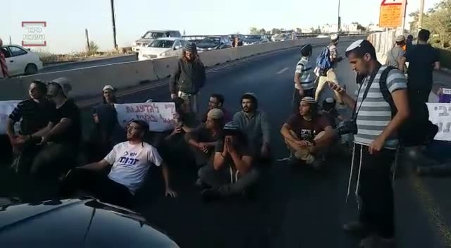 עשרות מפגינים חוסמים את הכניסה לירושלים במחאה על פינוי היישובים נתיב האבות בשבוע שעבר ותפוח מערב היום. המפגינים יושבים על הכביש וקוראים קריאות מחאה (בארץ)
