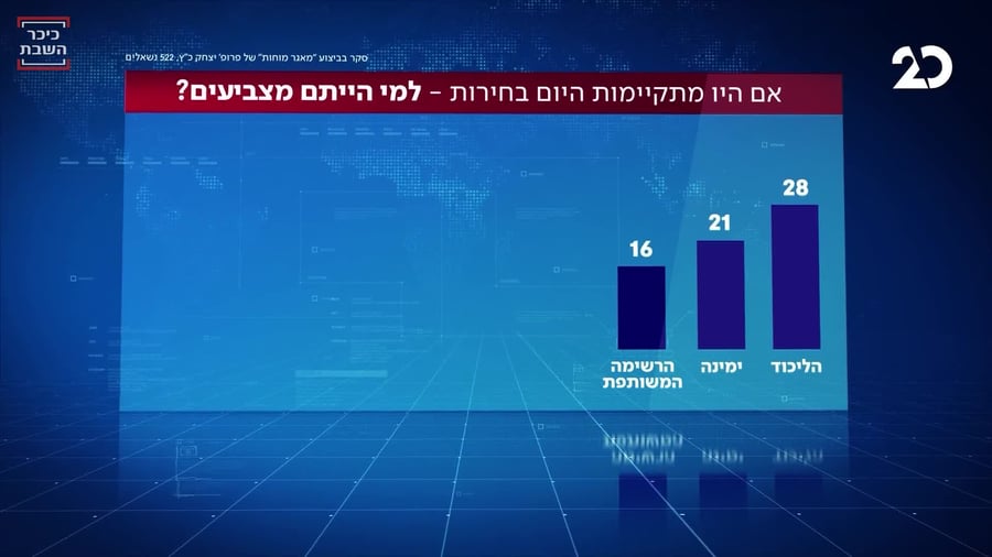 הרשימה הערבית תשאר עם 16, יש עתיד תל"ם, ידרדרו לכיוון ה-11 מנדטים ואילו חולדאי ואייזנקוט יקבלו 11 וכחול לבן ירדו רק במנדט ויעמדו על 8. ישראל ביתנו - 5, מרצ - 4.