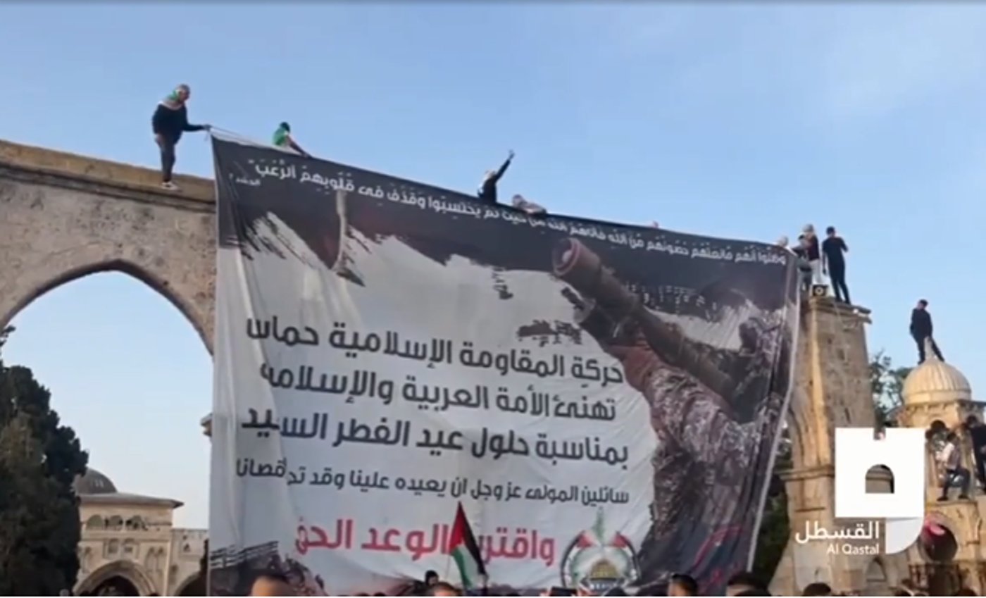 פעילי ארגון הטרור חמאס תלו הבוקר (שני) כרזת ענק על המסגד בהר הבית עם תמונת חמוש שמחזיק בטיל נ"מ ודברי ברכה לכבוד החג המוסלמי 'עיד אל פיטר', שמציין את סוף חודש הרמדאן. "תנועת ההתנגדות האסלאמית מברכת את האומה הערבית לרגל עיד אל פיטר", נכתב בכרזה.