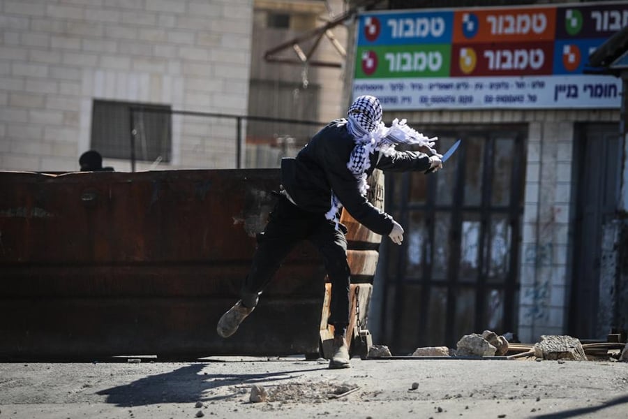 במקום נראו מחבלים עם סכינים ביד מיידים אבנים על ניידת משטרה עם שוטרים בפנים.