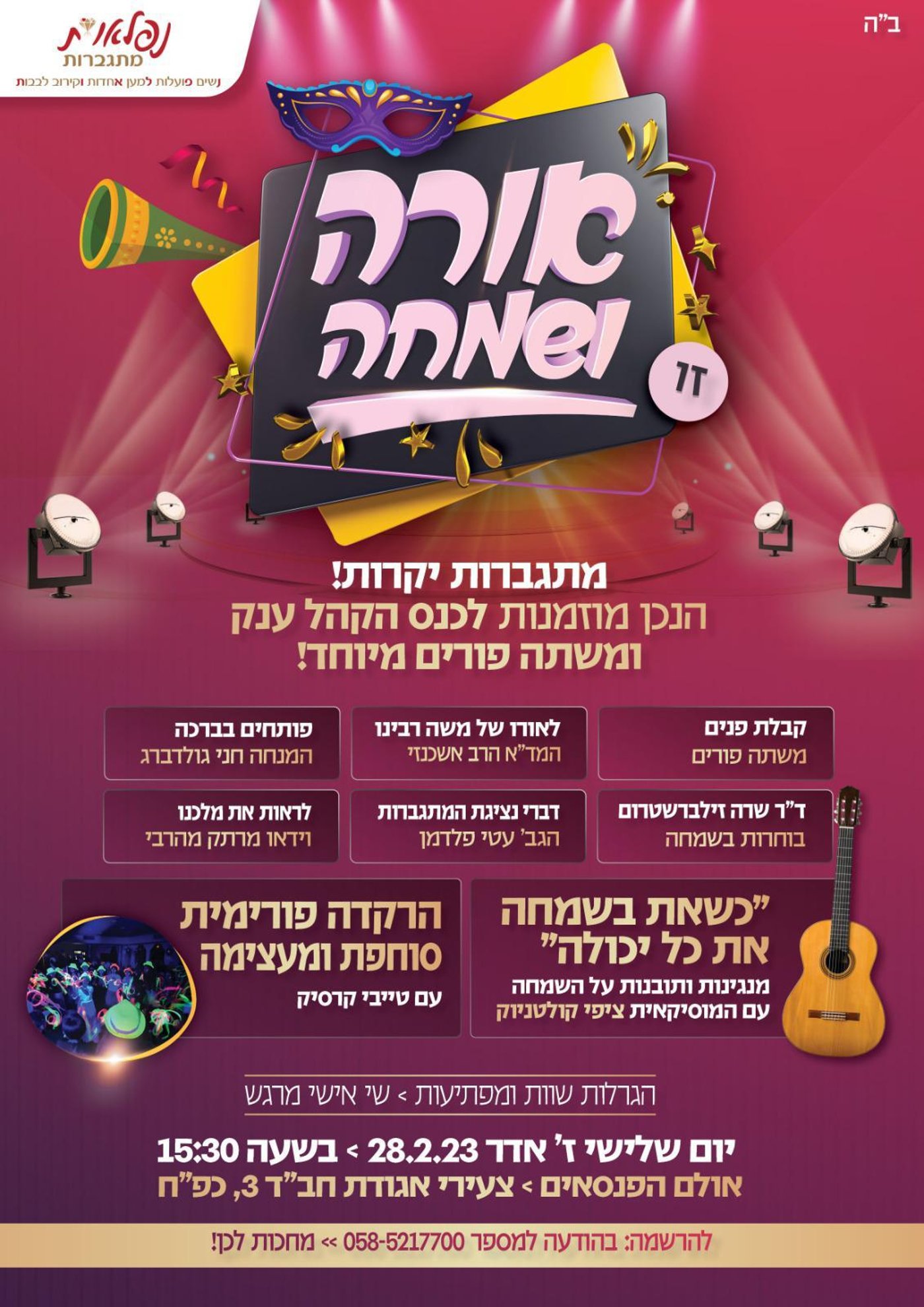ומחודש הצמיחה לחודש השמחה, צוות נפלאות כבר עמל על ההפקה הבאה: חגיגת פורים מיוחדת ל"מתגברות" - מאות אלמנות בגיל השלישי שלוקחות חלק בקביעות בפעילות "נפלאות מתגברות" ברחבי הארץ. במסיבה שתתקיים באולם "הפנסאים" מצפה למשתתפות תכנית עשירה במיוחד הכוללת מופע מוזיקלי מרגש המשלב נגינה ותובנות מעמיקות, הרקדה סוחפת, הגרלות פרסים שוות, מתנה אישית לכל משתתפת וכמובן - משתה פורים כיד המלך עם סעודה בשרית מפנקת.