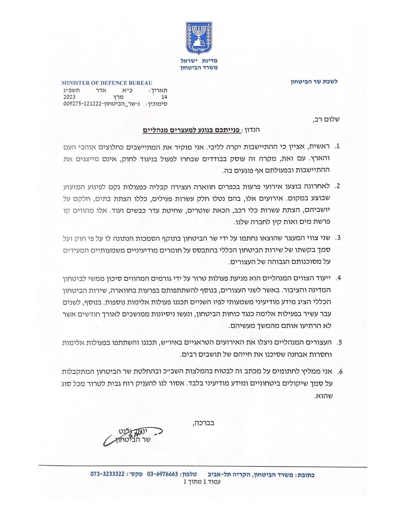 לסיום, הוא כותב: "אני ממליץ לחתומים על מכתב זה לבטוח בהמלצות השב"כ ובהחלטת שר הביטחון המתקבלות על סמך שיקולים ביטחוניים ומידע מודיעיני בלבד. מכל סוג שהוא".