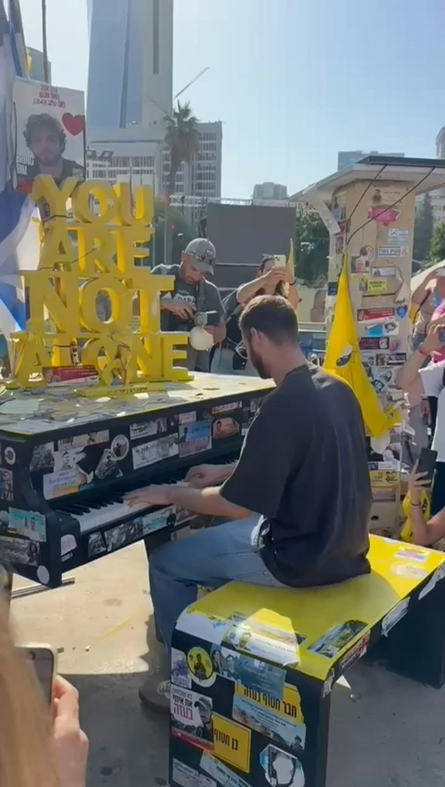 כעת, כאמור, התייצב אלון ליד הפסתנר הזה, מול המיצג שמעליו תמונתו, וניגן בפסנתר, שבכל צידיו דבוקות בו מדבקות שונות על חטופים שהיו בשבי.