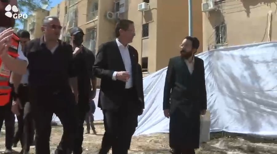 אל זירת הנפילה הקשה בערד שבדרום הארץ, הגיע היום (ראשון) נשיא המדינה יצחק הרצוג. הוא סייר בין הבניינים ההרוסים ובמקום נפילת הטיל, מלווה בחסידי גור מקומיים ובנציגות מהעירייה.