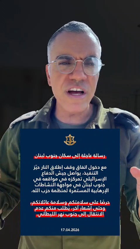 "צה"ל ממשיך להיות ערוך בעמדותיו בדרום לבנון למול פעילות הטרור המתמשכת של חיזבאללה", נמסר בהודעה. "למען שמירה על ביטחונכם ושלום משפחותיכם, ועד להודעה חדשה, הינכם נדרשים לא לנוע מדרום לנהר הליטאני".