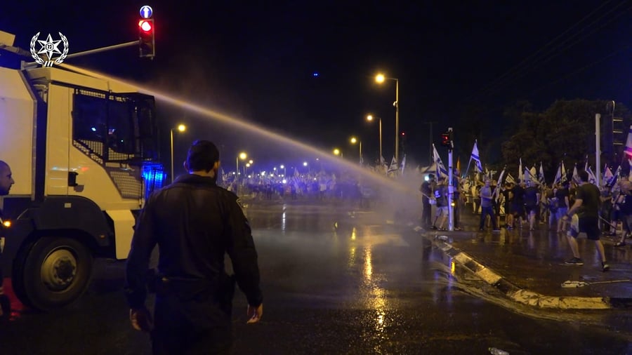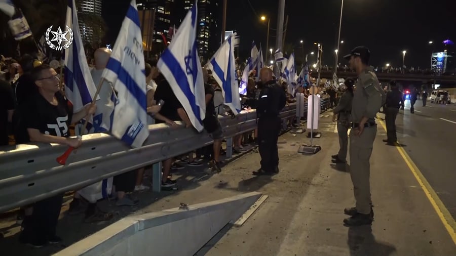 22:07 - המשטרה הכריזה "הפגנה בלתי חוקית" ברחוב גבעת התחמושת בתל אביב. כוחות המשטרה פועלים לפנות את המפגינים מהכביש בסיוע פרשים ומכת"זית.