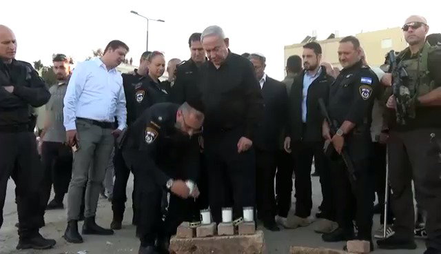 ראש הממשלה נתניהו לשוטרים: "אני פה עם השר לביטחון לאומי, עם המפכ"ל, עם אמיר והלוחמים והלוחמות הגיבורים שניהלו פה קרב למופת, איבדו חברים. המשטרה מאחורינו נהרסה ואנחנו בונים חדשה, אבל זו עדות למה שהתרחש כאן. אני שמעתי את הסיפורים, את התושייה ואומץ לב והערבות הדדית שזה פשוט מופת למדינת ישראל. אני מצדיע בשם כל עם ישראל וכל אזרחי ישראל בפניכם, אתם גיבורים של ממש. כל הכבוד לכם.