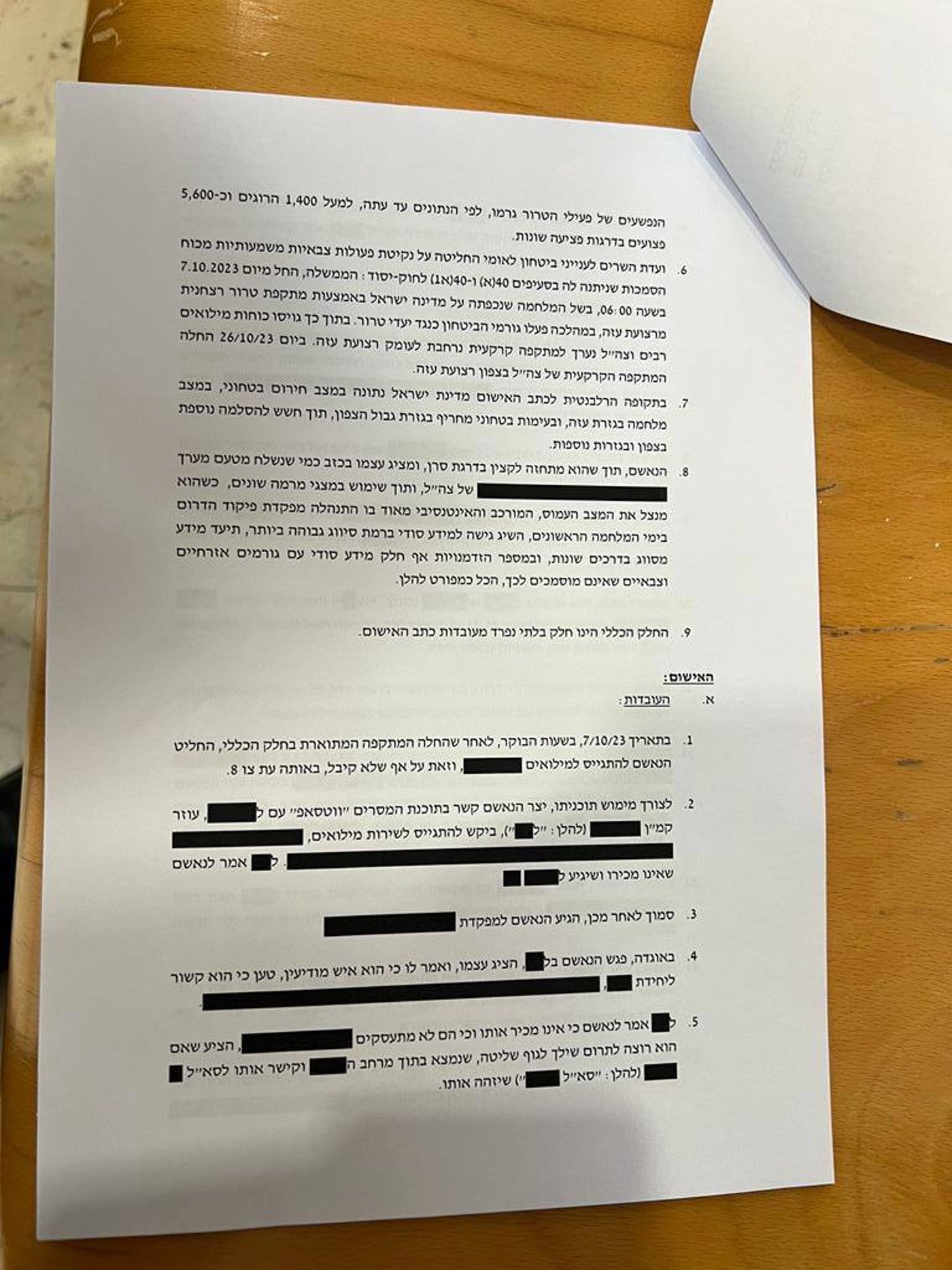 באותו היום הוא נטל את הסלולרי של קצינת ביטחון מידע וממנה הוא שלח הודעות על מספרי הורגים ופצועים בטבח שמחת תורה. בנוסף הוא כתב בהודעה לעצמו - "נשמח שתראה בחמ"ל איך אפשר לסייע ולייעל את העבודה", וכן כתב: "תדווח ותורה לנו מה לעשות כאשר מקבלים דיווחים סותרים מהשטח", באמצעות ההודעות שנשלחו אליו כביכול מאותה קצינה - לה הוא לקח את הסלולרי, הוא הציג את עצמו כמי שהוא המוסמך לפעול בתחומים האלו בחמ"ל.
