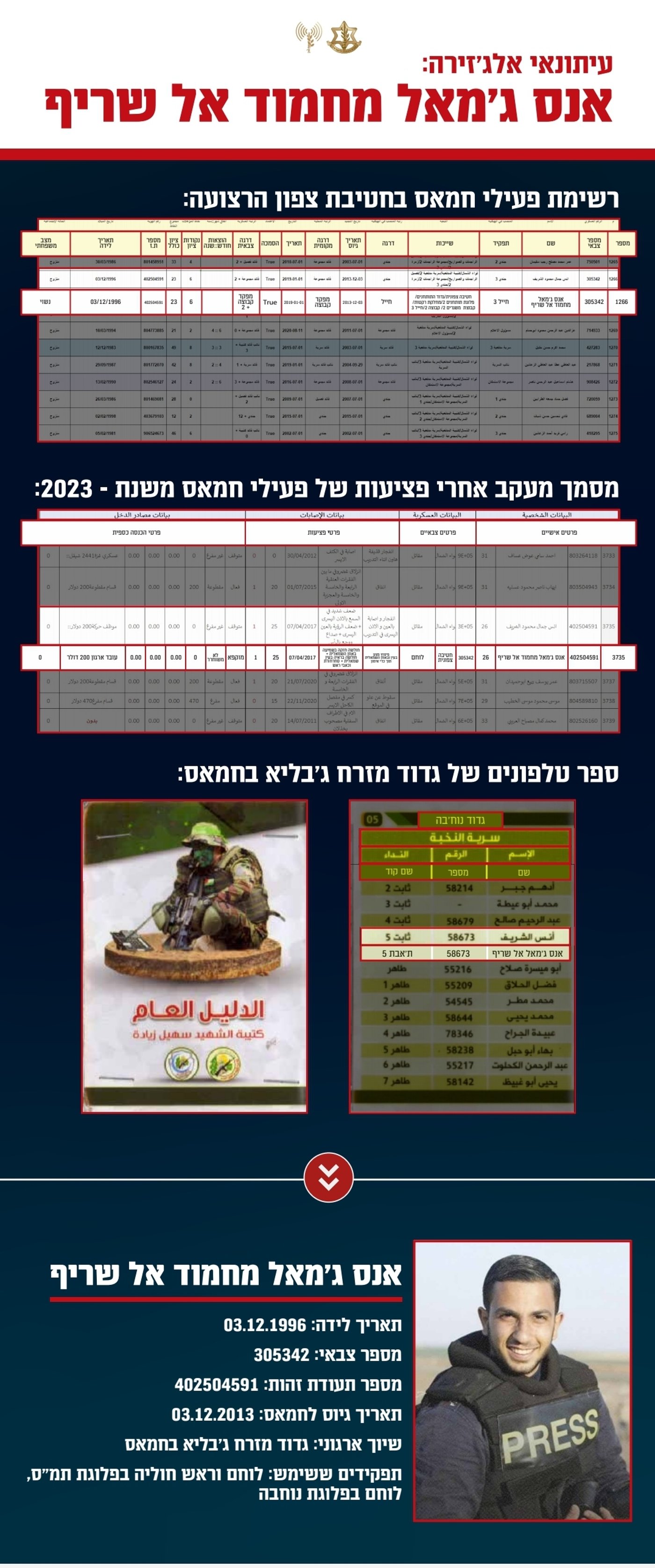 17:00: צה"ל חושף מידע מודיעני ומסמכים רבים שנמצאו ברצועת עזה המאשרים את השתייכותם הצבאית לארגוני הטרור חמאס והג'יהאד האסלאמי של שישה עיתונאי רשת אל-ג'זירה בעזה - אנס אלשריף, עלאא' סלאמה, חסאם שבאת, אשרף אלסראג', איסמאעיל אבו עמר וטלאל אלערוקי.