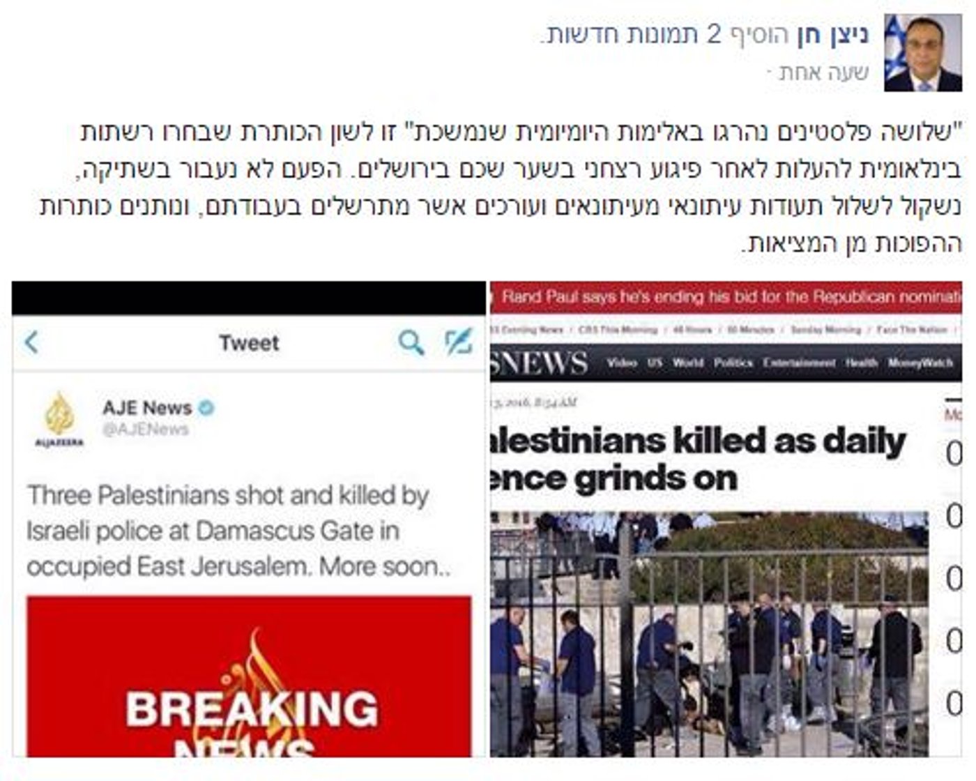 אלא שב-CBS הדיווח היה על כך ש"שלושה פלסטינים נהרגו באירוע האלימות היומי", ובאלג'זירה הדיווח היה על כך ש"שלושה פלסטינים נורו ונהרגו על ידי שוטרים ישראלים בירושלים הכבושה".