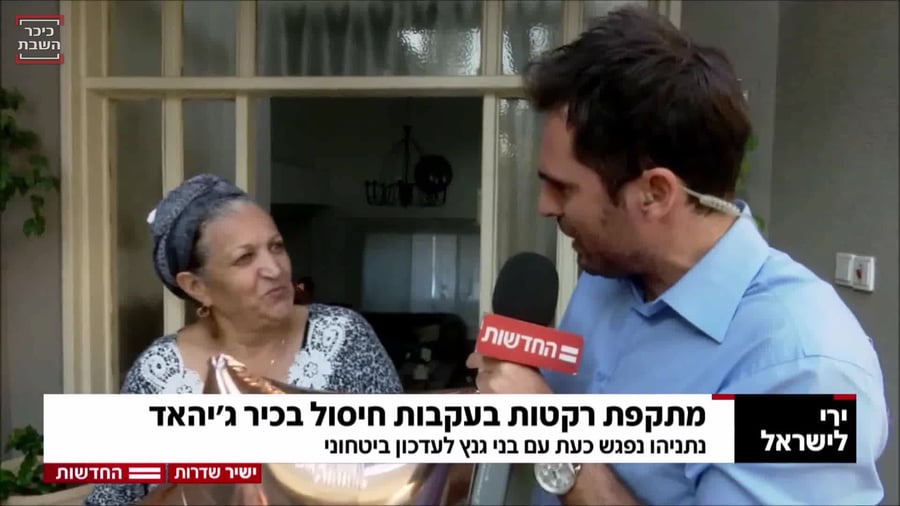 שמחה מהולה בדאגה: ברוריה, אישה מבוגרת המתגוררת בשדרות, הבחינה היום (שלישי) בעיתונאי תמיר סטיינמן מ'ערוץ 12', משדר במשך שעות מרחובות העיר בעקבות ההסלמה בדרום והזמינה אותו ואת צוות הצילום לאכול ארוחה דשנה שבישלה במיוחד עבורם.