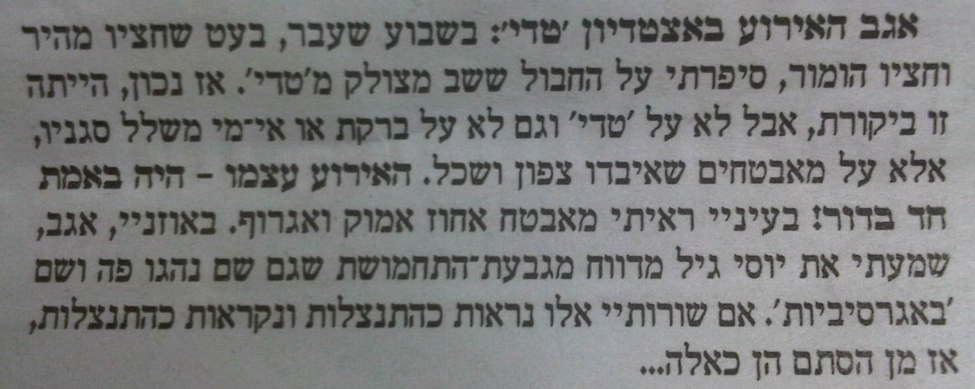 בשבוע שעבר, פרסם בעיתון 'בקהילה' העיתונאי צביקה יעקבזון, המשמש גם כמנהל סיעת ש"ס בכנסת, קטע ביקורתי על האירוע בטדי, באמצעות סיפור במדורו 'ליבא בעי'.
