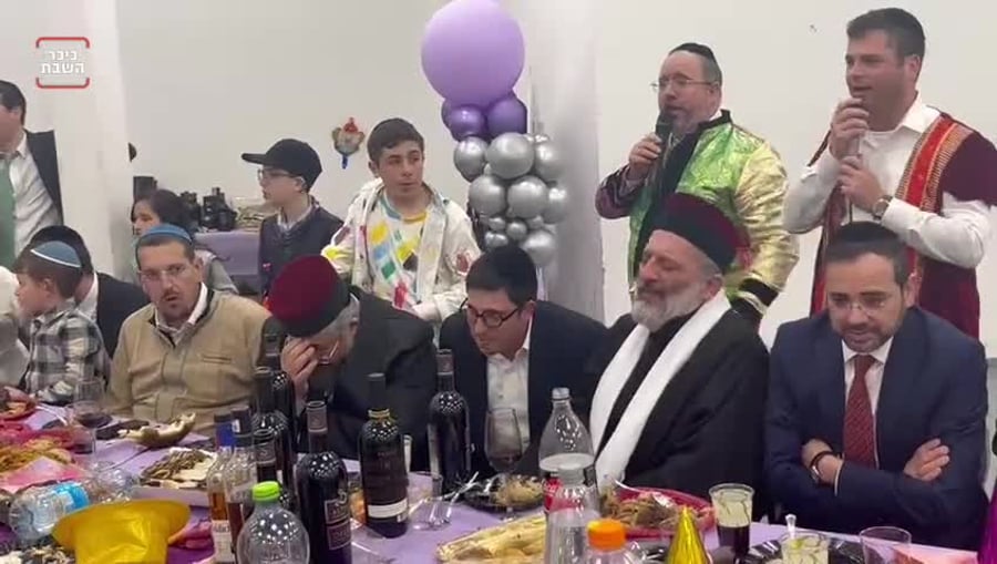 הזמר אבי מילר ואיש הכשרות הרב רפאל מנת, בשירי רגש עם יו"ר ש"ס חבר הכנסת אריה דרעי במשתה הפורים שערך. דרעי נראה נרגש במיוחד מאוחילה לקל של הרב הלל פלאי.