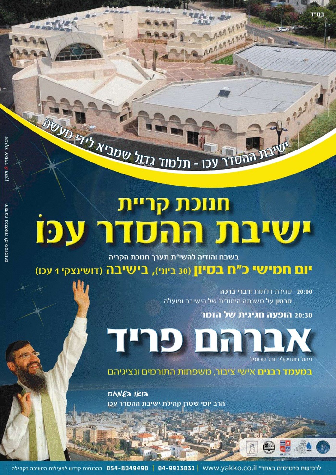 נתחיל בגדול הזמר אברהם פריד שמגיע לסיבוב קצר בארץ, ובין השאר יחנוך בהופעה מיוחדת את "קריית ישיבת ההסדר" בעכו ביום חמישי כ"ח סיון (30 יוני) בשעה 20:00 בערב.
