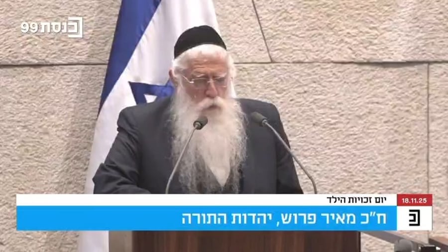 ח"כ מאיר פרוש נאם היום (שלישי) במליאת הכנסת בציון היום המיוחד לזכויות הילד ותקף את הפגיעה בשנה האחרונה בזכויות הילדים החרדים שנפגעו בגלל שאביהם לומד תורה.