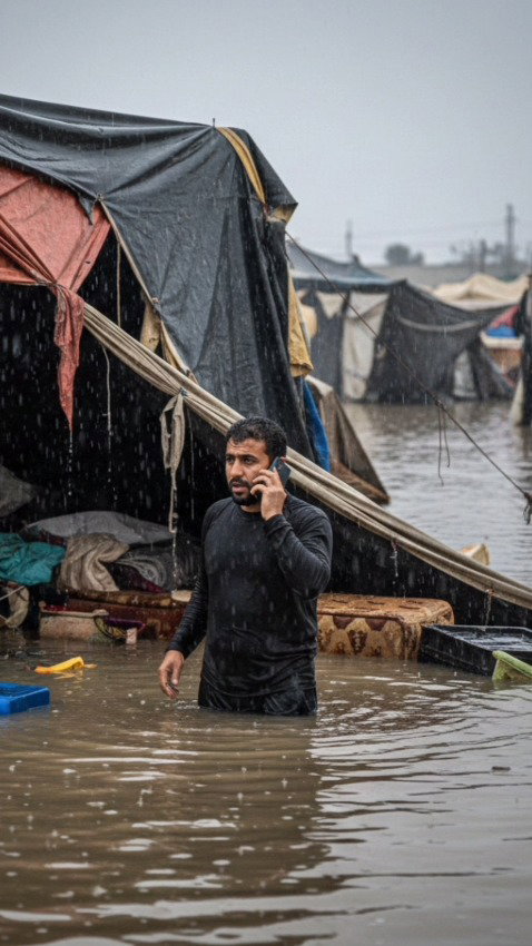 התושב העזתי פירט את המחסור הקריטי הקיים במחנות העקורים וציין כי חסרים להם שלושה דברים עיקריים: יריעות לאוהלים, מזרנים וכיסויים לילדים. "אתה יודע שכל החיים שלנו, אחרי שהבתים נהרסו, הם באוהלים. ובאוהלים כבר שנה וחצי – הם התבלו מהשמש", הסביר התושב, והוסיף ביחס למלחמה: "המבול (הטופאן) האמיתי שיחזור אליכם", אמר העזתי על טבח השבעה באוקטובר שמכונה "מבול אל-אקצא" על ידי אויבינו.