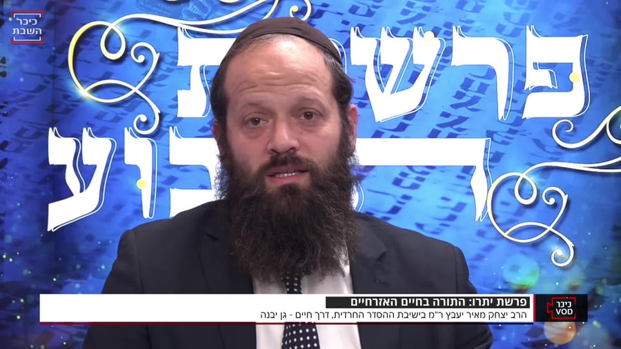הרב יצחק מאיר יעבץ, ר"מ בישיבת ההסדר החרדית דרך חיים בגן יבנה, בפינה לפרשת השבוע - פרשת יתרו. התורה ממקמת את מעמד הר סיני בין שתי פרשיות שעוסקות במערכת המשפט ובדיני ממונות, ללמדנו שהתורה מקיפה את כל מערכות החיים, וכי בכל אורחותינו עבדי ה' אנחנו (יהדות)