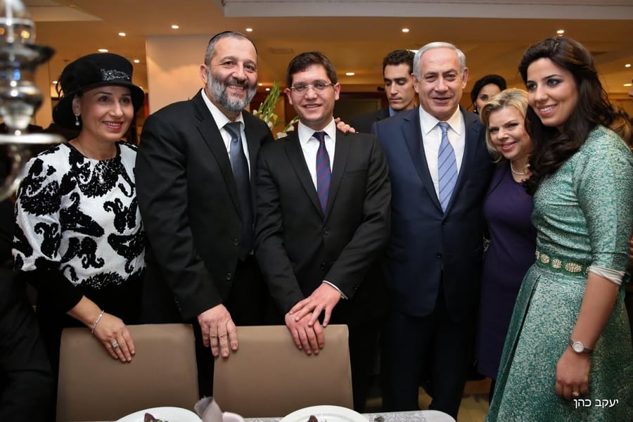 שמחת שבע ברכות: ראש הממשלה בנימין נתניהו ורעייתו שרה הגיעו יחד עם שרי הממשלה לשמחת השבע ברכות של בתו של יו"ר ש"ס אריה דרעי שהתקיימה במלון 'גני ירושלים'.