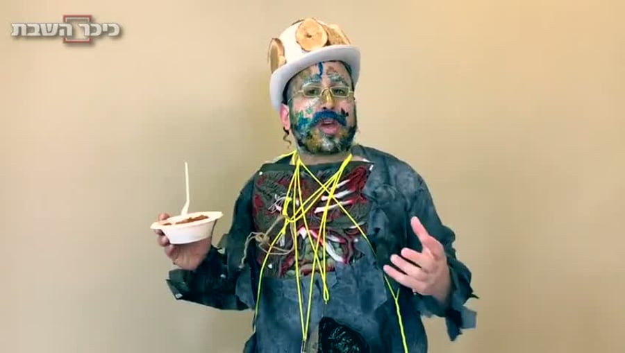 שמלצר מצביע על בגדיו, על התחפושת, ומסביר: "הנה אנשים רואים את העוגה ואת הפיצה את האוכל וחושבים שיש כסף שיש עשירות. אבל תראו מה קורה מיד אחר כך, מה קורה לגוף. זה מחלות.