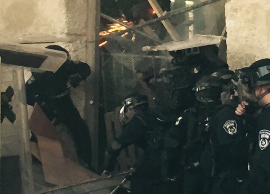 מיד עם כניסת כוח המשטרה ומג״ב לשטח ההר , הפורעים רעולי הפנים נמלטו לתוך המסגד והחלו ליידות עשרות אבנים ובלוקים לעבר השוטרים מתוך מסגד אל אקצא, כמו כן ירו עשרות רבות של זיקוקין בכינון ישיר לעבר השוטרים.