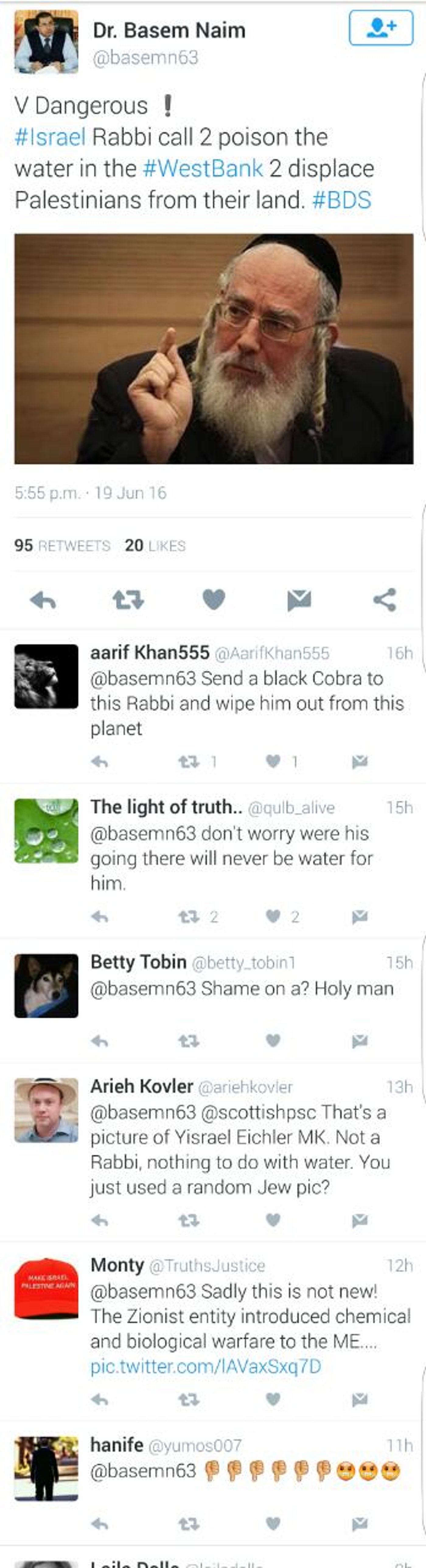 כשחיפש דמות רבנית לציוץ, העלה השר הפלסטיני לשעבר את תמונתו של ח"כ אייכלר וההסתה בטוויטר וברשתות החברתיות החלה.