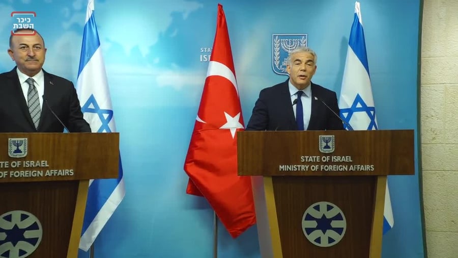 בפגישה שנערכה היום (רביעי) בין שר החוץ יאיר לפיד, לעמיתו הטורקי מבלוט צ'אבושולו אמר לפיד: "הסכמנו לחדש את פעילותה של הועדה הכלכלית המשותפת, ולהתחיל לעבוד על הסכם תעופה חדש בין מדינותינו."