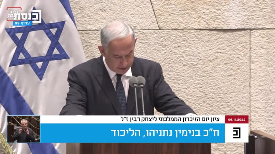 ראש הממשלה המיועד, הגיע בשעה זו לכנסת ונאם מעל משכן הכנסת לזכרו של ראש הממשלה המנוח יצחק רבין ז"ל | נאומו של נתניהו היה מפויס והוא קרא לאחדות בעם • צפו (כנסת)