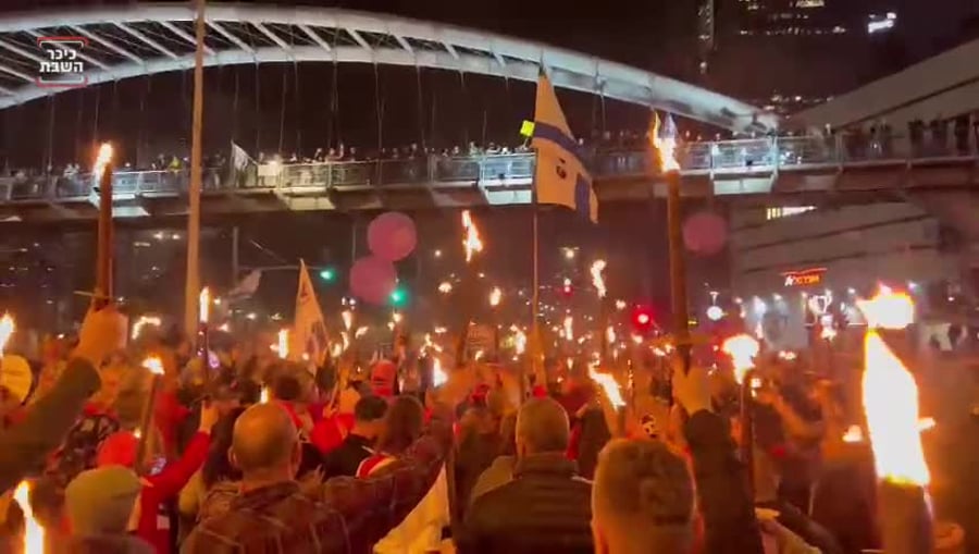 בינתיים, בתל אביב, בחיפה ובעוד מקומות נערכות הפגנות ענק כנגד הממשלה וכנגד הרפורמה המשפטית שמתכנן שר המשפטים יריב לוין. בתל אביב נערכת הפגנה עם עשרות אלפי משתתפים.