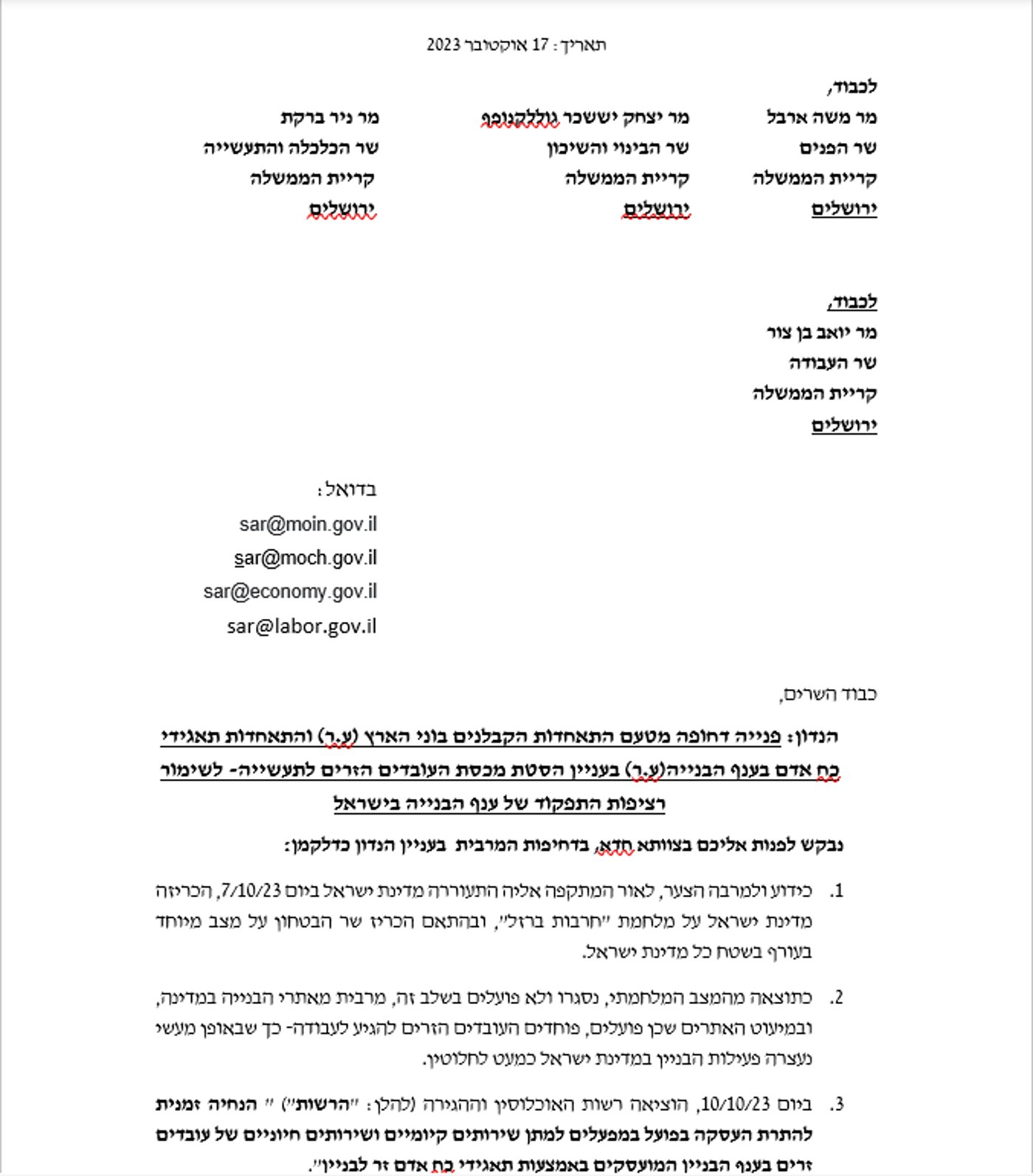 במכתבם מציינים השניים כי כידוע ולמרבה הצער, לאור המתקפה אליה התעוררה מדינת ישראל ביום 7/10/23, הכריזה מדינת ישראל על מלחמת "חרבות ברזל", ובהתאם הכריז שר הבטחון על מצב מיוחד בעורף בשטח כל מדינת ישראל. כתוצאה מהמצב המלחמתי, נסגרו ולא פועלים בשלב זה, מרבית מאתרי הבנייה במדינה, ובמיעוט האתרים שכן פועלים, פוחדים העובדים הזרים להגיע לעבודה- כך שבאופן מעשי נעצרה פעילות הבניין במדינת ישראל כמעט לחלוטין.