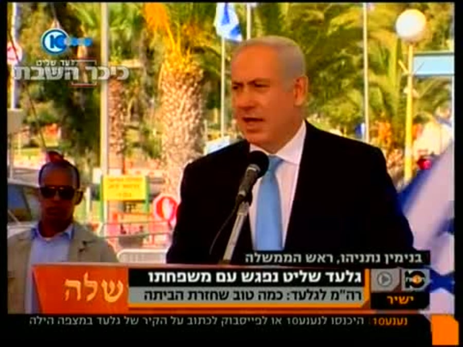 "ביום הזה כולנו מאוחדים בשמחה ובכאב", אמר היום ראש הממשלה, עם שובו של גלעד שליט ארצה. "לפני שנתיים וחצי חזרתי לתפקיד ראש הממשלה. אחת המשימות המרכזיות והמורכבות שמצאתי על שולחני ואתה שמתי על לוח ליבי היתה להחזיר את חיילנו החטוף גלעד שליט, חי ובריא הביתה.