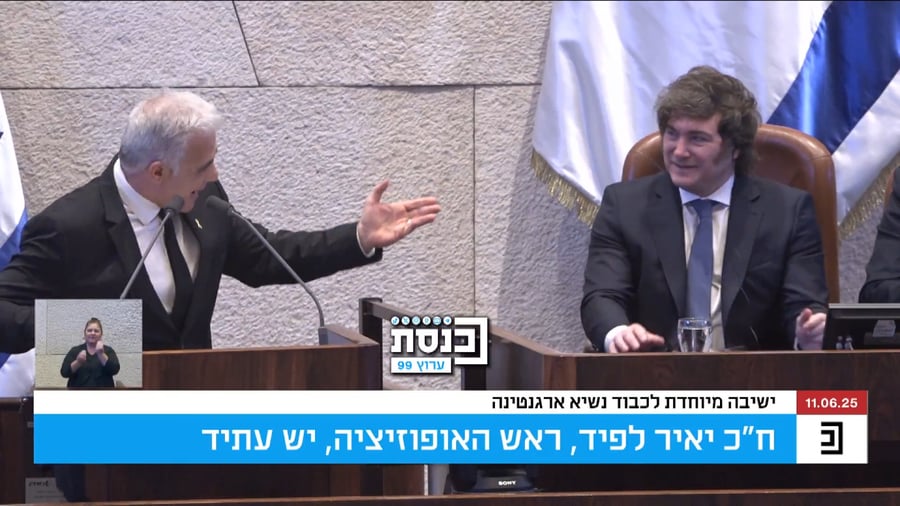 לקול מחיאות כפיים מהקואליציה, ראש האופוזיציה יאיר לפיד פנה הערב (רביעי), בנאומו במליאת הכנסת, לנשיא ארגנטינה מיליי, במילים אחדות בספרדית.