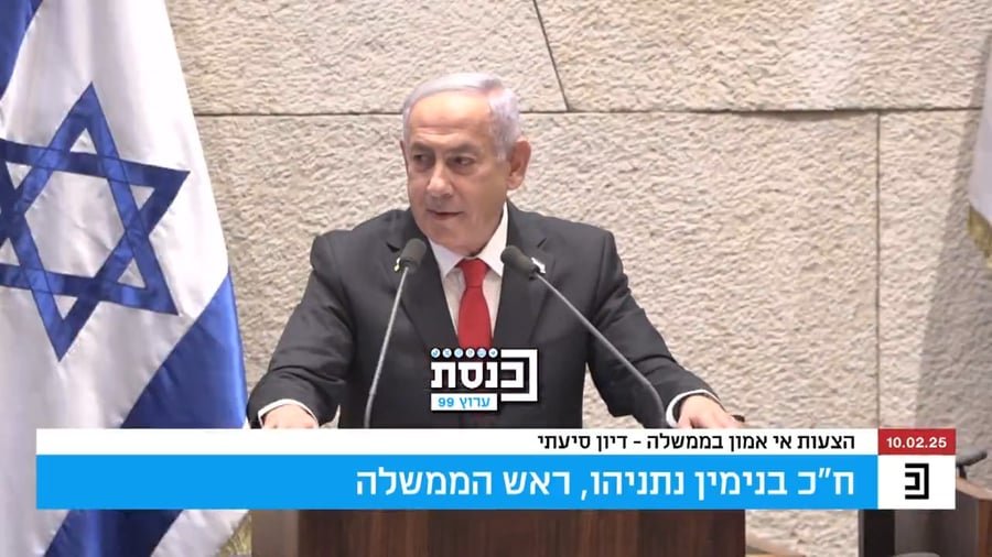 יומיים אחרי ששב מביקורו המדיני בוושינגטון שם נועד עם הניא טראמפ, ושעות אחרי עדותו המתישה בבית המשפט המחוזי בתל אביב. ראש הממשלה בנימין נתניהו נשא נאום דרמטי במליאת הכנסת במסגרת דיון בהצבעת אי אמון שהגישו חברי האופוזיציה.