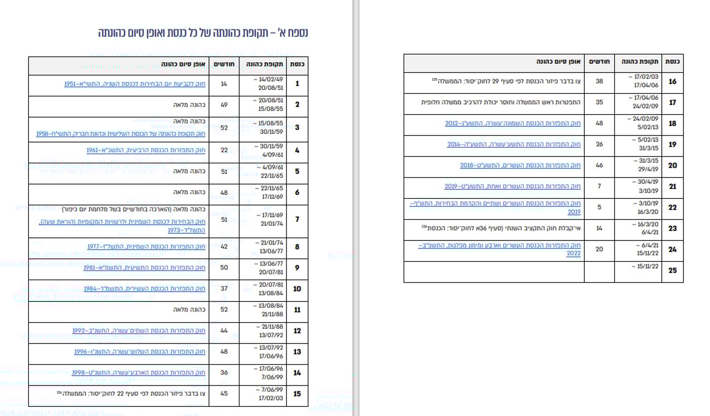 חמש מערכות בחירות נערכו בכשלוש וחצי שנים, החל מתקופת פורים פסח בשנת תשע"ט ועד חשוון תשפ"ג, תקופות כהונה קצרות שהשפיעו באופן ממשי על כל תהליכי החקיקה ועבודת חברי הכנסת.