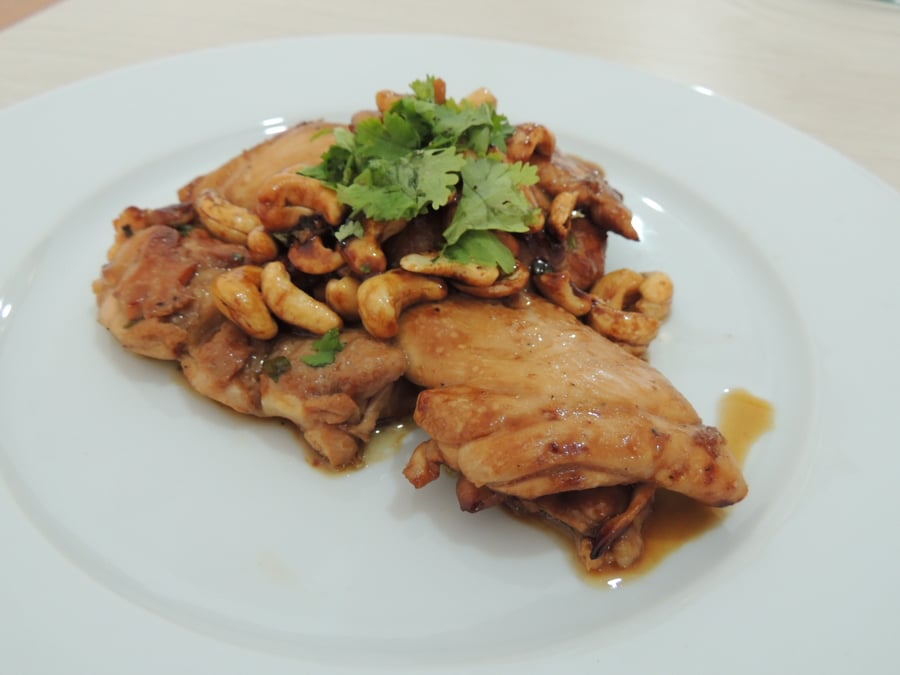 במשך הטיגון מורחים את הפרגיות ברוטב הנותר בקערה. ומוסיפים את הקשיו ומגישים חם
