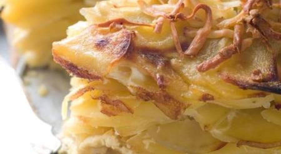 - בתבנית חרס או פיירקס מניחים את פרוסות תפוחי האדמה צפופים אחד ליד השני, ומעל עד גובה שווה