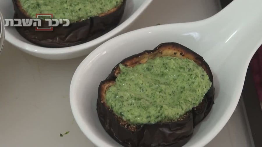 מניחים פרוסת חציל, מורחים מעל בנדיבות קרם תרד ומעל מניחים נבטים דקים (אלפלפא).