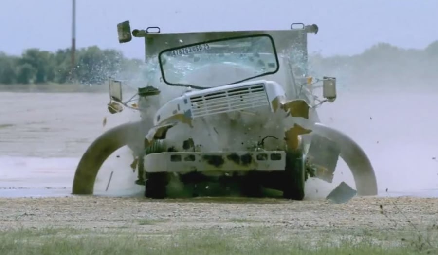 בסרטון המתעד את מבחן הריסוק נראית המשאית, שהופעלה מרחוק באמצעות כבל, נחתכת לשניים, כאשר למחסום כמעט ולא קורה דבר.