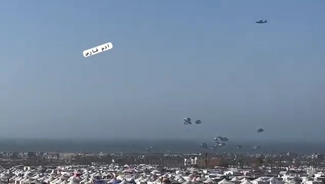 18:30: לאחר תקרית המשאיות, שבה נהרגו עזתים רבים בעת חלוקת הסיוע ההומניטרי במשאיות, לראשונה מאז תחילת המלחמה ארצות הברית הצניחה היום עשרות אלפי ארוחות לתושבי רצועת עזה, באמצעות מטוסי תובלה - שהפילו את הארוחות מהאוויר | צפו בתיעוד